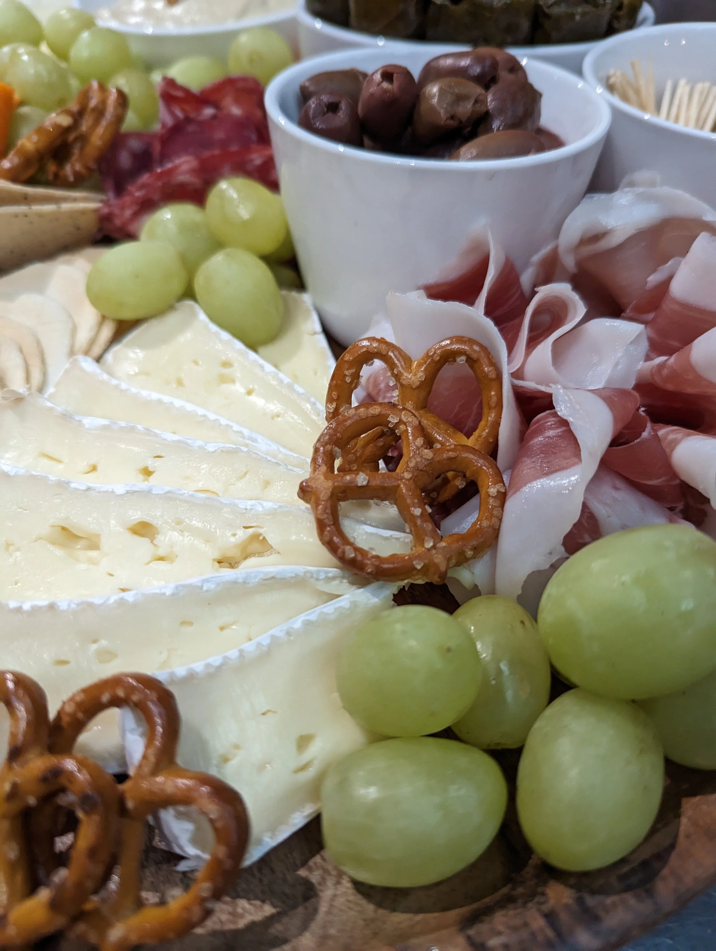 Fresh fruit, dried fruit, soft cheese, hard cheese hummus, cured meats, olives, cornichons, nuts, crackers, pretzels.
